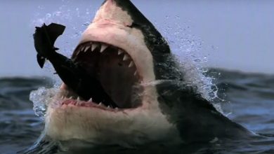 قرش ضخم يفترس فقمة بطريقة غريبة ( فيديو )