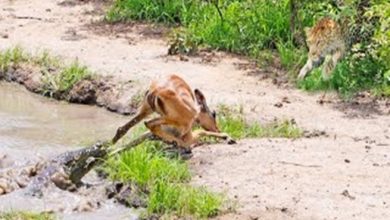 نجت غزالة صغيرة من فصيلة “إمبالا” من بين فكي تمساح، لتسقط فريسة بين أنياب فهد جائع. وبحسب ما يظهر فيديو…