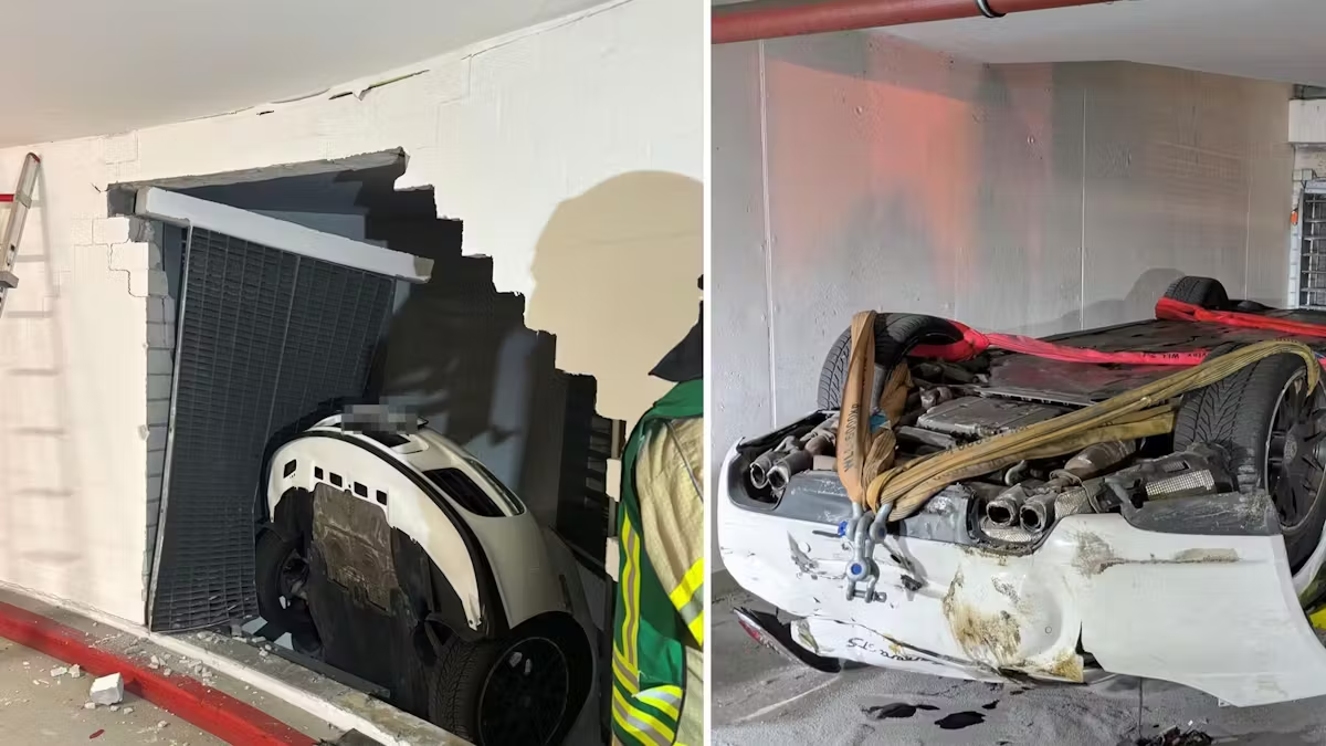 ألمانيا : حادث غريب في لودفيغسبورغ .. سيارة بورشه تخترق جداراً خرسانياً وتعلق في الهواء