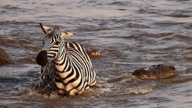 ” حمار الوحش ” يجهد للإفلات من تمساحين وسط النهر ( فيديو )