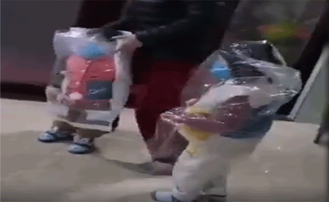 أم صينية تضع أولادها في أكياس بلاستيكية خوفاً من ” كورونا ” ( فيديو )