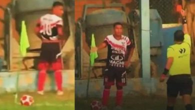 لاعب كرة القدم البيروفي سيباستيان مونوز، يحصل على بطاقة حمراء بعد أن قرر التبول على جانب الملعب، أثناء توقف اللعب…