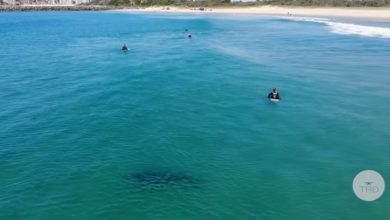 طائرة درون تلتقط لحظة اقتراب قرش ضخم من راكبي أمواج ( فيديو )