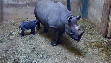 وحيد قرن أسود مهدد بالانقراض يقف على قدميه بعمر 53 دقيقة ( فيديو )