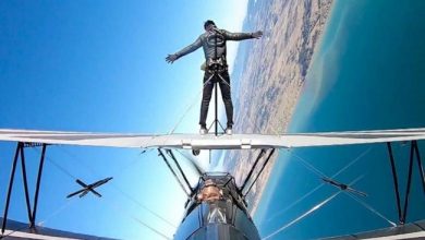 رجل يمشي على أجنحة طائرة و هي تدور بزاوية 360 درجة ! ( فيديو )