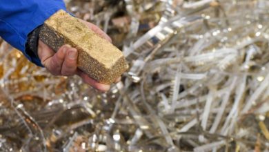 تنزل شبه مقطورة نفايات صناعية ستحوّل إلى سبائك أو شظايا رقيقة من الذهب في مصنع “أغوزي” الألماني الذي يعدّ من…