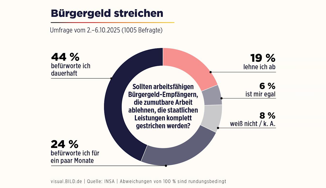استطلاع جديد لمؤسسة INSA أظهر أن 44٪ من الألمان يؤيدون إيقاف المساعدات الحكومية بشكل دائم عن مستفيدي “Bürgergeld” القادرين…