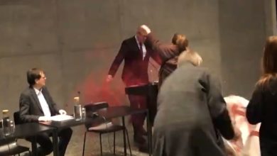 لأجل غزة .. ناشطة ترشق وزير خارجية أوروبي بمسحوق أحمر ( فيديو )