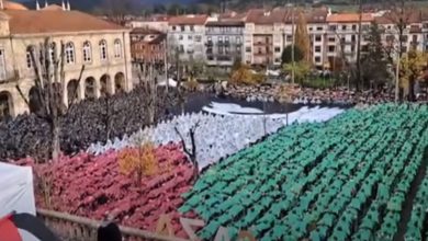 إسبانيا : غرنيكا التي قصفها النازيون والفاشيون في1937 ترسم علم فلسطين بتجمع بشري ضخم ( فيديو )