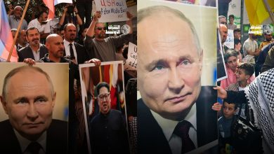 رفع متظاهرون فلسطينيون في مدينة الخليل بالضفة الغربية صور الرئيس الروسي فلاديمير بوتين وصور الزعيم الكوري الشمالي كيم جونغ…