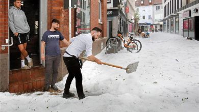 صور تظهر طبقة من البَرَد الأبيض ارتفاعها عدة سنتيمترات، بعد عاصفة رعدية محلية ،اجتاحت وسط مدينة #ريوتلنجن في ولاية بادن…