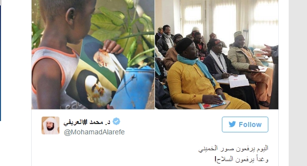 العريفي يعلق على صورة لطفل أفريقي يرفع صورة الخميني : غداً يرفعون السلاح