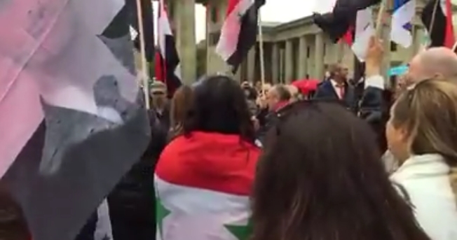 ألمانيا : موالون لبشار الأسد يرفعون صوره و أعلام روسيا و يهتفون تأييداً لإجرامه في برلين ( فيديو )