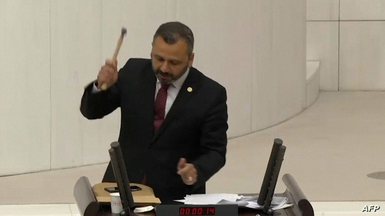 نائب تركي يحطم هاتفه بمطرقة في البرلمان احتجاجاً على قانون جديد ! ( فيديو )