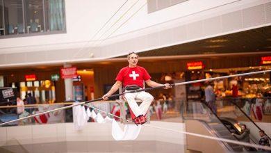 رجل سويسري يجلس 8 ساعات على حبل مشدود و يدخل ” موسوعة غينيس ” ( فيديو )