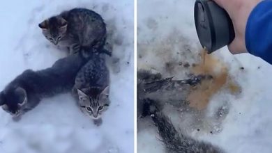 رجل ينقذ 3 قطط صغيرة من الموت بكوب قهوة ( فيديو )