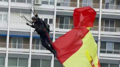 مظلي يصطدم بعمود للإنارة بدلاً من الهبوط أمام منصة فيها ملك إسبانيا و زوجته ( فيديو )