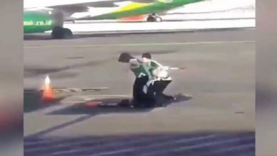 امرأة أندونيسية تطارد طائرتها على المدرج ! ( فيديو )