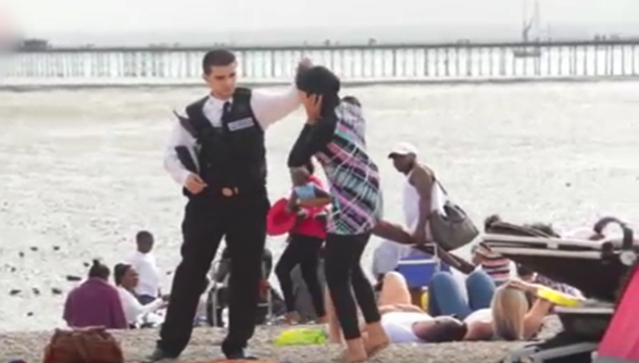 بالفيديو .. شاهد رد فعل البريطانيين عندما حاول شرطي منع ” البوركيني “