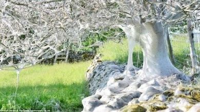 بريطانيا : آلاف اليرقات تحول شجرة إلى شرنقة حريرية عملاقة ( فيديو )