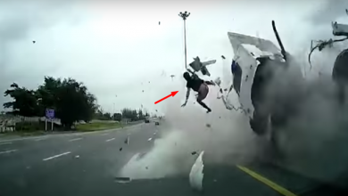 تايلاند : سائق شاحنة يحلق في الهواء بعد أن اصطدمت مركبته بحاجز خرساني ( فيديو )
