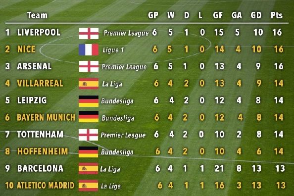 ليفربول و آرسنال و نيس يتصدرون ترتيب الدوريات الأوروبية الكبرى