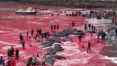 مذبحة حيتان تصبغ مياه المحيط الأطلسي باللون الأحمر