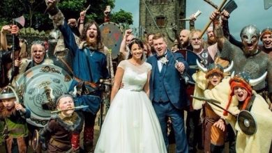 عروسان بريطانيان يحاصران بمجموعة من رجال الـ ” فايكينغ ” أثناء حفل زفافهما