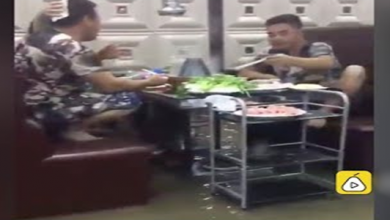بالفيديو .. صينيون يستمتعون بوجبة ساخنة داخل مطعم غمرته مياه الفيضانات !