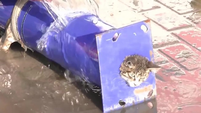 الصين : إنقاذ ” قطة ” علقت داخل أنبوب ( فيديو )