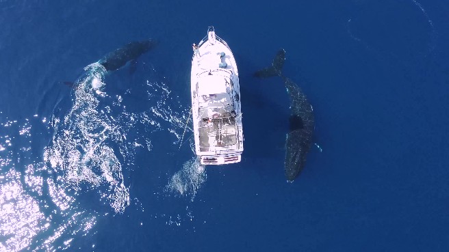 في مشهد خاطف للأنفاس .. ” حيتان ” تحوم حول قارب في عرض البحر ( فيديو )