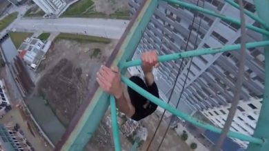 مغامر مغربي يتدلى من رافعة على ارتفاع شاهق ( فيديو )