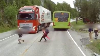 بالفيديو .. طفل نرويجي ينجو باعجوبة من شاحنة مسرعة