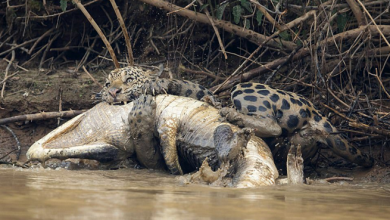 بالفيديو .. نمر ينصب فخاً لتمساح ضخم و يتمكن من افتراسه