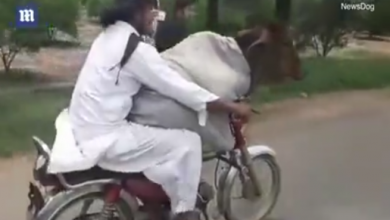 في باكستان .. بقرة تجلس بأحضان صاحبها على دراجة نارية ! ( فيديو )