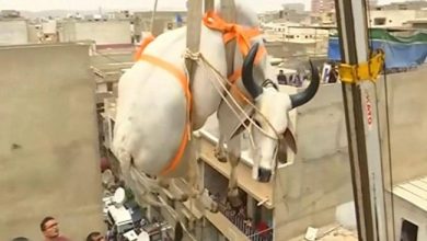 رافعة تنزل ثيراناً من سطح منزل في باكستان ( فيديو )