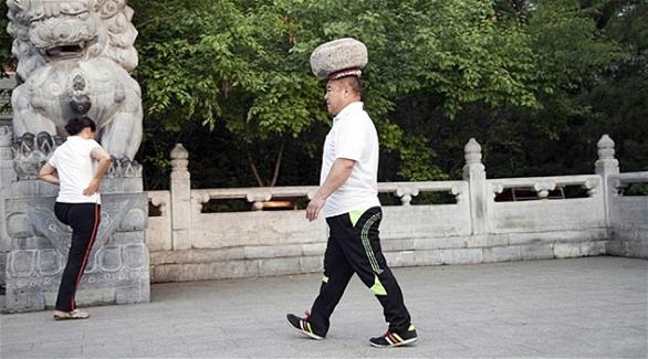 صيني يحمل حجراً على رأسه ليخسر الوزن الزائد !