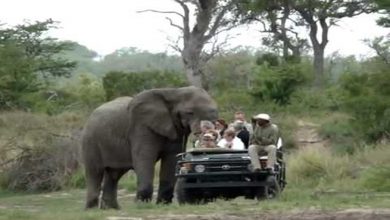 جنوب أفريقيا : فيل هائج يسحق سيارة مليئة بالسياح ( فيديو )