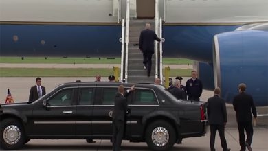 “ ورقة مرحاض ” تعلق بحذاء دونالد ترامب أثناء صعوده درج الطائرة الرئاسية ( فيديو )