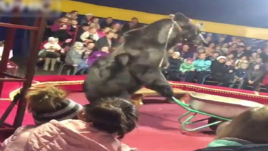 دب ضخم ينقض على مدربه خلال عرض في روسيا ( فيديو )