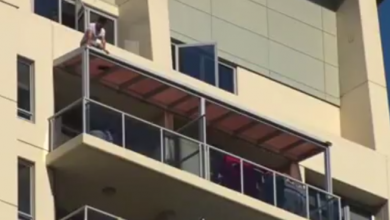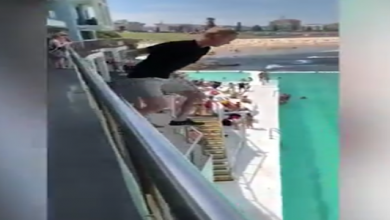 مغامر أسترالي يفاجئ الجميع بقفزة من شرفة فندق باتجاه بركة السباحة ( فيديو )