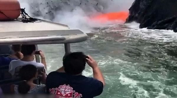 بالفيديو .. أطنان من الحمم البركانية تفاجئ السياح في عرض البحر